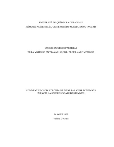 D'Aoust, Valérie (2025). Comment le choix volontaire de ne pas avoir d’enfants impacte la sphère sociale des femmes. Mémoire. Gatineau, Université du Québec en Outaouais, Département de travail social, 85 p.