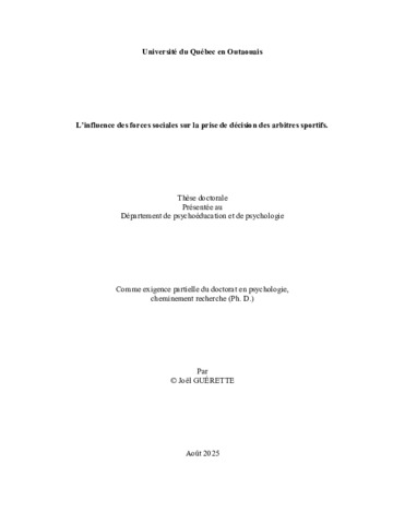 Guérette, Joël (2025). L’influence des forces sociales sur la prise de décision des arbitres sportifs. Thèse. Gatineau, Université du Québec en Outaouais, Département de psychoéducation et de psychologie, 203 p.