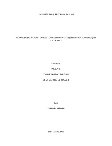 Bernier, Daphée (2025). Génétique des populations de tortues mouchetées (emydoidea blandingii) en Outaouais. Mémoire. Gatineau, Université du Québec en Outaouais, Département des sciences naturelles, 56 p.