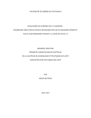 Bluteau, Adèle (2025). Humaniser les données de la pandémie : recherche-création en design graphique sur les diagrammes produits par le gouvernement durant la crise de COVID-19. Mémoire. Gatineau, Université du Québec en Outaouais, École des arts et cultures, 79 p.