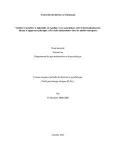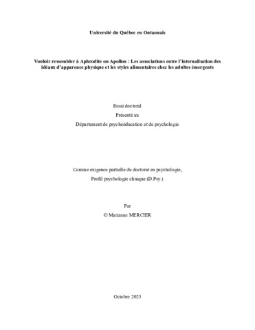 Mercier, Marianne (2025). Vouloir ressembler à Aphrodite ou Apollon : Les associations entre l’internalisation des idéaux d’apparence physique et les styles alimentaires chez les adultes émergents. Essai de troisième cycle. Saint-Jérôme, Université du Québec en Outaouais, Département de psychoéducation et de psychologie, 84 p.