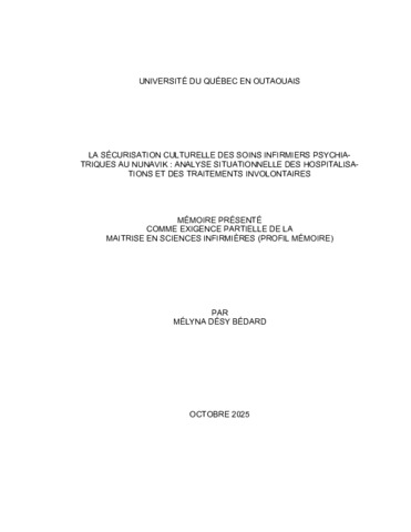 Désy Bédard, Mélyna (2025). La sécurisation culturelle des soins infirmiers psychiatriques au Nunavik : analyse situationnelle des hospitalisations et des traitements involontaires. Mémoire. Saint-Jérôme, Université du Québec en Outaouais, Département des sciences infirmières, 274 p.