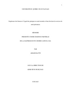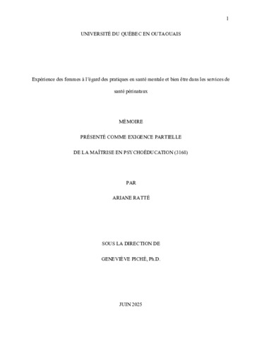 Ratté, Ariane (2025). Expérience des femmes à l’égard des pratiques en santé mentale et bien être dans les services de santé périnataux. Mémoire. Saint-Jérôme, Université du Québec en Outaouais, Département de psychoéducation et de psychologie, 105 p.
