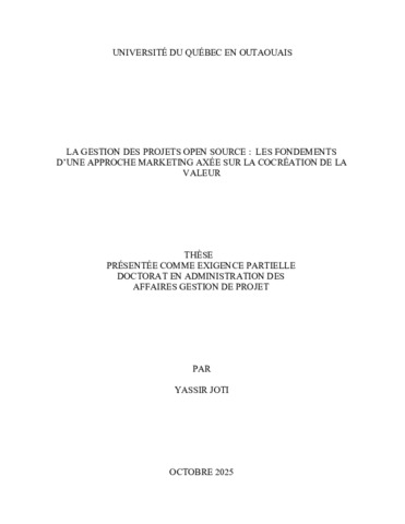 Joti, Yassir (2025). La gestion des projets open source : les fondements d’une approche marketing axée sur la cocréation de la valeur. Thèse. Gatineau, Université du Québec en Outaouais, Département des sciences administratives, 181 p.