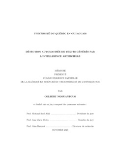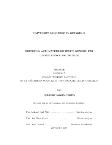 Ngouanfouo, Colbert (2025). Détection automatisée de textes générés par l’intelligence artificielle. Mémoire. Gatineau, Université du Québec en Outaouais, Département d’informatique et d’ingénierie, 64 p.