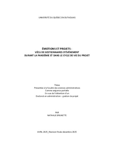 Brunette, Nathalie (2025). Émotions et projets : vécu de gestionnaires d’événement durant la pandémie et dans le cycle de vie du projet. Thèse. Gatineau, Université du Québec en Outaouais, Département des Sciences administratives, 392 p.