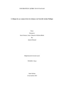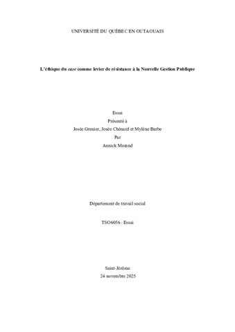 Morand, Annick (2025). L’éthique du care comme levier de résistance à la Nouvelle Gestion Publique. Essai de deuxième cycle. Saint-Jérôme, Université du Québec en Outaouais, Département de travail social, 61 p.