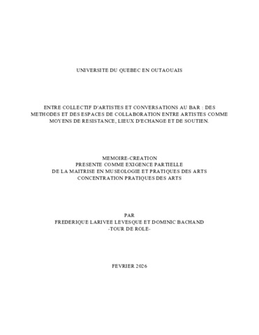 Bachand, Dominic et Larivée Levesque, Frédérique (2026). Entre collectif d'artistes et conversations au bar : des méthodes et des espaces de collaboration entre artistes comme moyens de résistance, lieux d'échange et de soutien. Mémoire. Gatineau, Université du Québec en Outaouais, École des Arts et Cultures, 74 p.