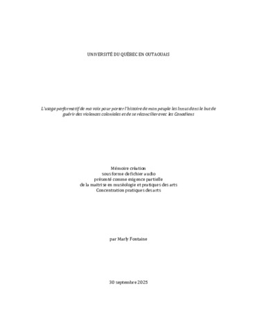Fontaine, Marly (2025). L’usage performatif de ma voix pour porter l’histoire de mon peuple les Innus dans le but de guérir des violences coloniales et de se réconcilier avec les Canadiens. Mémoire. Gatineau, Université du Québec en Outaouais, École des arts et cultures.