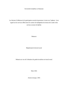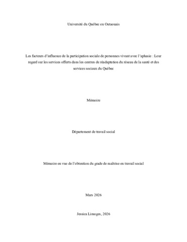 Limoges, Jessica (2026). Les facteurs d’influence de la participation sociale de personnes vivant avec l’aphasie : Leur regard sur les services offerts dans les centres de réadaptation du réseau de la santé et des services sociaux du Québec. Mémoire. Gatineau, Université du Québec en Outaouais, Département de travail social, 158 p.